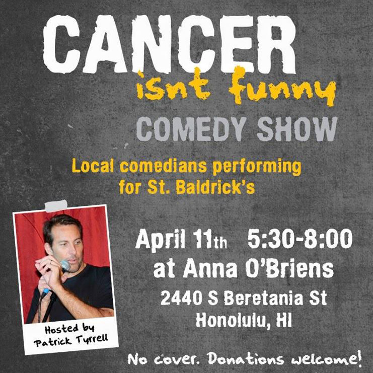 I’m excited to do stand-up comedy in a show that will benefit St. Baldrick’s, an organization that raises money for childhood cancer research. The numbers are staggering, but with more research more kids are finding hope that just didn’t exist in recent past. The show, Cancer Isn’t Funny Comedy Show, is a chance for the local comedy community to come together for a good cause.